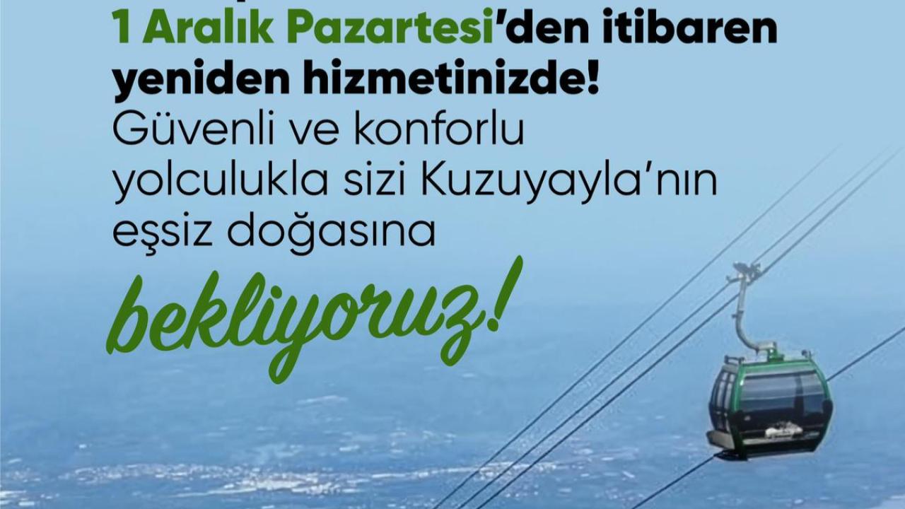 Görevli personelin iş sağlığı ve güvenliğinin ön planda tutulduğu çalışmaların bitirilmesi ile birlikte Kartepe Teleferik hattı, 01 Aralık Pazartesi günü (bugün) kaldığı yerden hizmete açıldı. Kuzuyayla'ya güvenli ve konforlu ulaşımı sağlayan teleferik hattı, hafta içi ve hafta sonları saat 10.00 ile 19.00 saatleri arasında ziyaretçilerini manzaranın ve doğanın en dikkat çekici haliyle buluşturuyor.